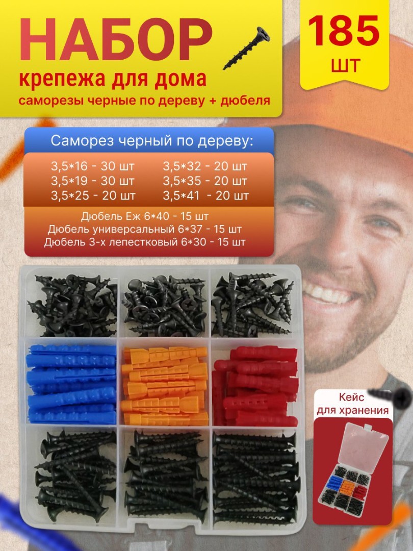 Набор крепежа " Универсальный №6 " Саморезы черные по дереву , металлу , универсальный , с прессшайбой и дюбеля - 265 шт